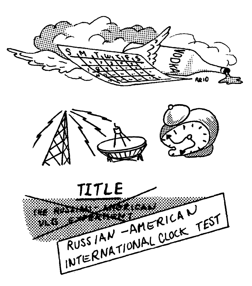 A selection of the whimsical cartoons drawn to accompany Kenneth Kellermann’s three-part 1970 article in the NRAO’s newsletter, The Observer, that recounted the story of the 1969 VLBI experiment. (Cartoon of the radio dish and clock by Peggy Weems, and cartoons of the international clock test and the calendar with vodka by Shelton Reid, all courtesy of NRAO/AUI/NSF/CC BY 4.0
