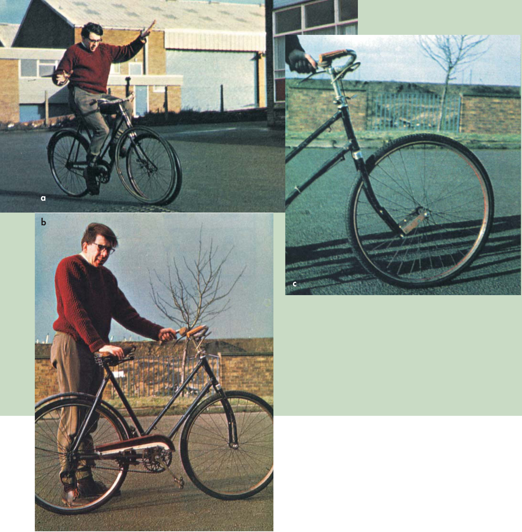 Figure 1. Unridable bicycles. David Jones is seen here with three of his experimental machines, two of which turned out to be ridable after all. (a) At the top of this page is URB I, with its extra counter-rotating front wheel that tests the gyroscopic theories of bicycle stability. (b) At left is URB III, whose reversed front forks give it great stability when pushed and released riderless. (c) URB IV (immediately above) has its front wheel mounted ahead of the usual position and comes nearest to being “unridable.”