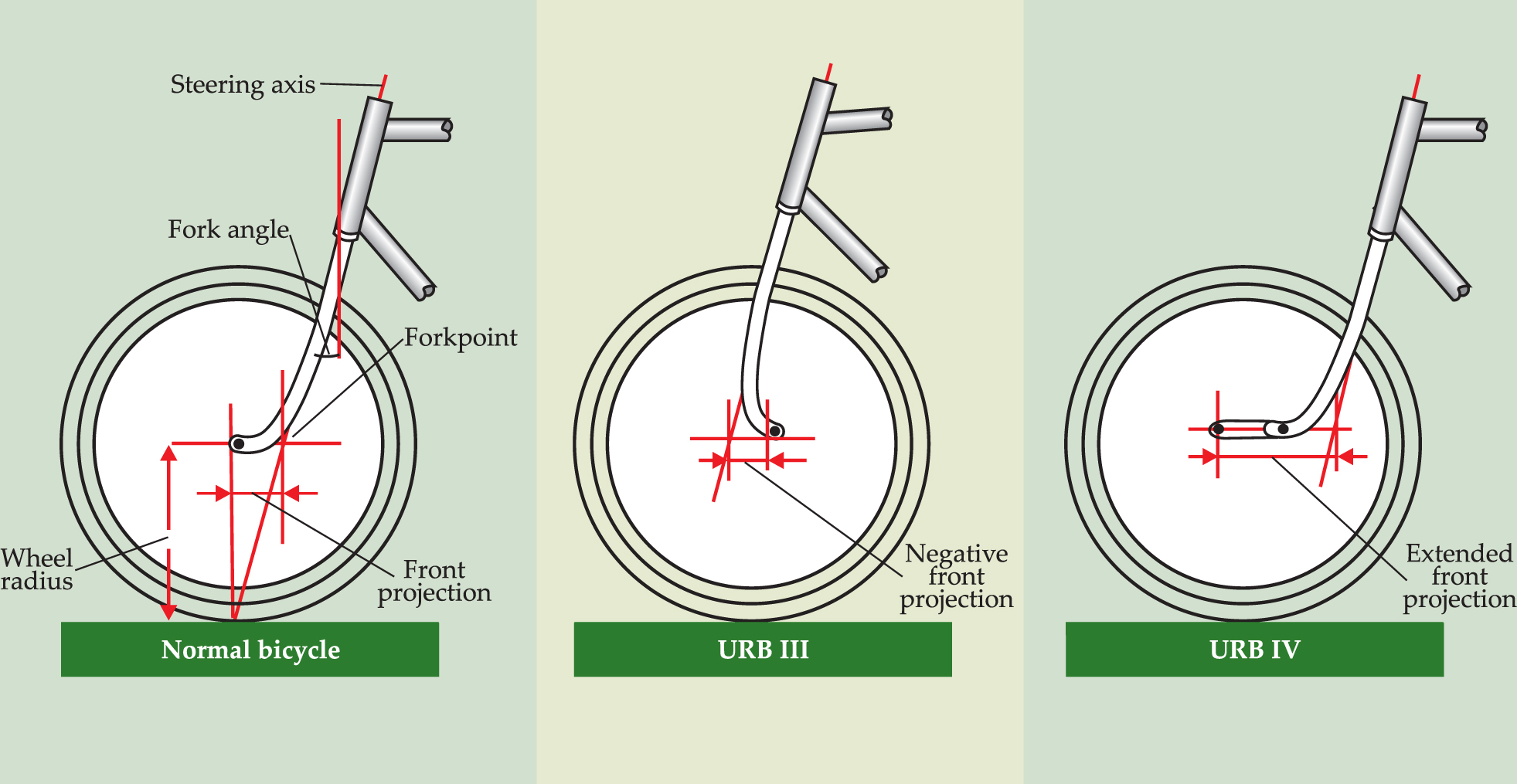 Figure 2. Front-fork geometry. On the left is a normal bicycle. The center shows URB III with reversed forks giving a negative front projection, and on the right is URB IV with extended front projection.