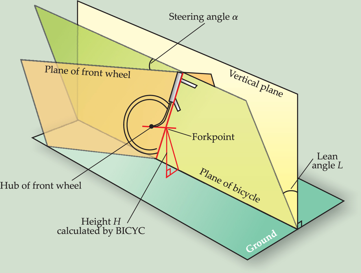 Figure 3. A tricky trigonometrical problem. We need to know H, the height of the forkpoint from the ground, for a leaning bicycle. Subroutine BICYC calculates both the vertical height and the height in the plane of the bike.