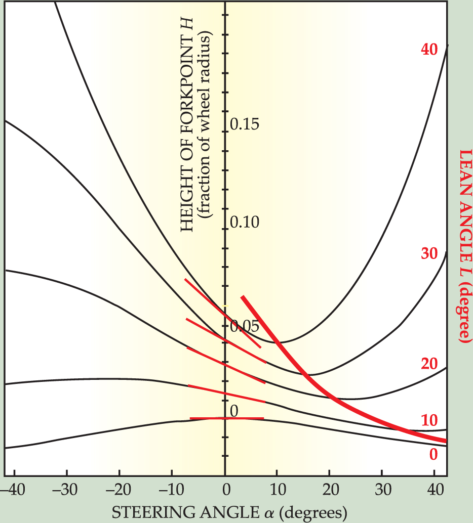 I looked instead at the slope of the height versus steering-angle curve at zero steering angle, because this slope is proportional to the twisting torque on the front wheel of a tilted bike. Then, if H is the height of the forkpoint, the torque varies as –dH/dα at small values of α, the steering angle.