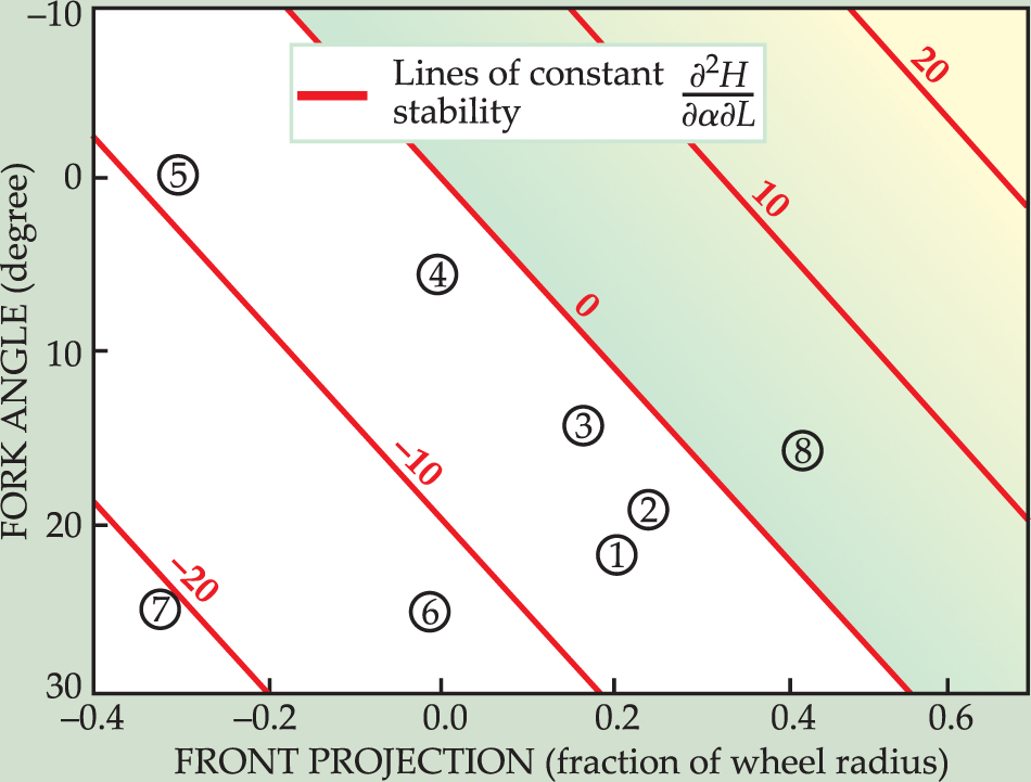I therefore computed d 2 H/dαdL for a wide range of steering geometries, and drew lines of constant stability on a diagram connecting the two parameters of steering geometry—the angle of the front-fork steering axis and the projection of the wheel center ahead of this axis. I then plotted on my stability diagram all the bicycles I could find—ranging from many existing models to old high-wheeled “penny-farthings” to see if they supported the theory.