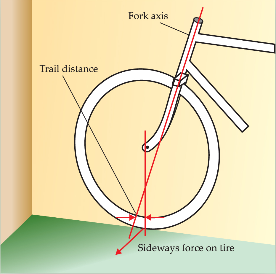 The contact point of the bicycle’s tire is behind the steering axis. As a result, when the bicycle leans a torque is developed that turns the front wheel.