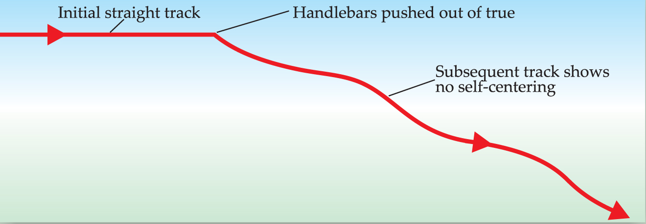 Nevertheless this theory can not be true, or at least it can not be the whole truth. You experience a powerful sense, when riding a bicycle fast, that it is inherently stable and could not fall over even if you wanted it to. Also a bicycle pushed and released riderless will stay up on its own, traveling in a long curve and finally collapsing after about 20 seconds, compared to the 2 seconds it would take if static. Clearly the machine has a large measure of self-stability.