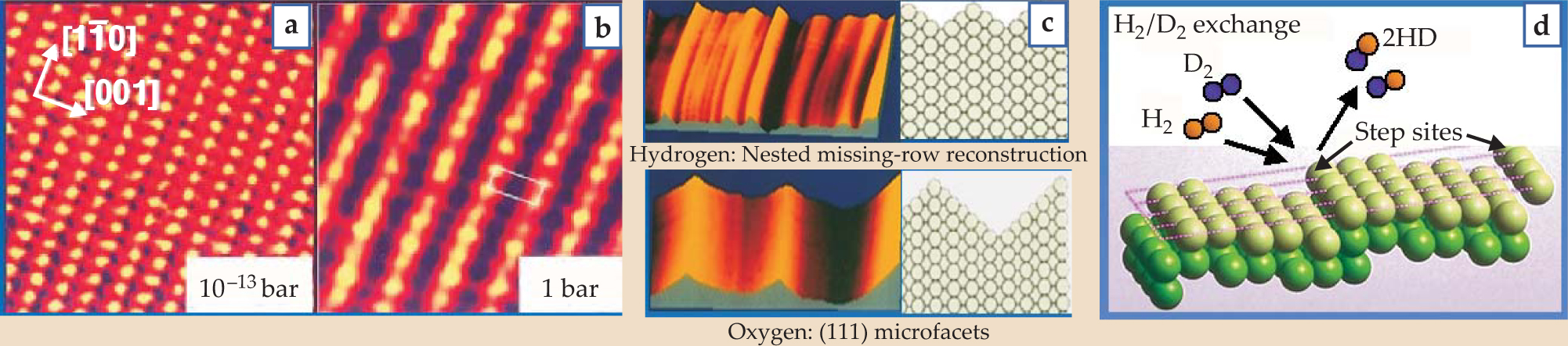 Figure 1. Scanning tunneling microscopy topographical images showing a copper (110) surface (a) before and (b) during hydrogen exposure. (c) STM topographical images of adsorbate-induced surface reconstructions of platinum (110) surface in 1.7 bar hydrogen and 1.0 bar oxygen. (d) A molecular-beam scattering experiment reveals that the reaction probability of hydrogen/deuterium exchange is three orders of magnitude higher on a stepped surface than on a defect-free Pt(111) crystal face.