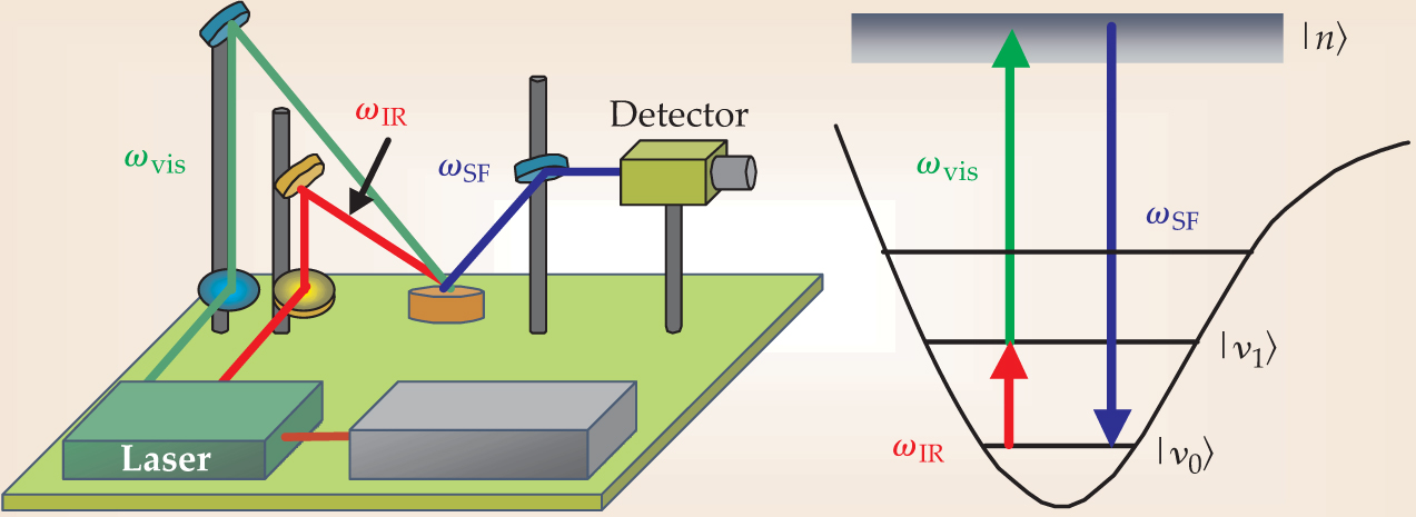 Figure 2. Sum-frequency-generation vibrational spectroscopy identifies adsorbed molecules by their vibrational frequencies. The frequency ωvis of the visible laser beam is kept fixed, and the IR-beam frequency ωIR is varied. When ωIR coincides with a vibrational transition from |v 0〉 to |v 1〉 of an adsorbed molecule, the molecule is excited to a virtual state |n〉 and emits the sum frequency ωSF. Selection rules dictate that the two-photon transition to the virtual state is only allowed in a medium that lacks inversion symmetry, so the technique probes only those molecules adsorbed on the surface.