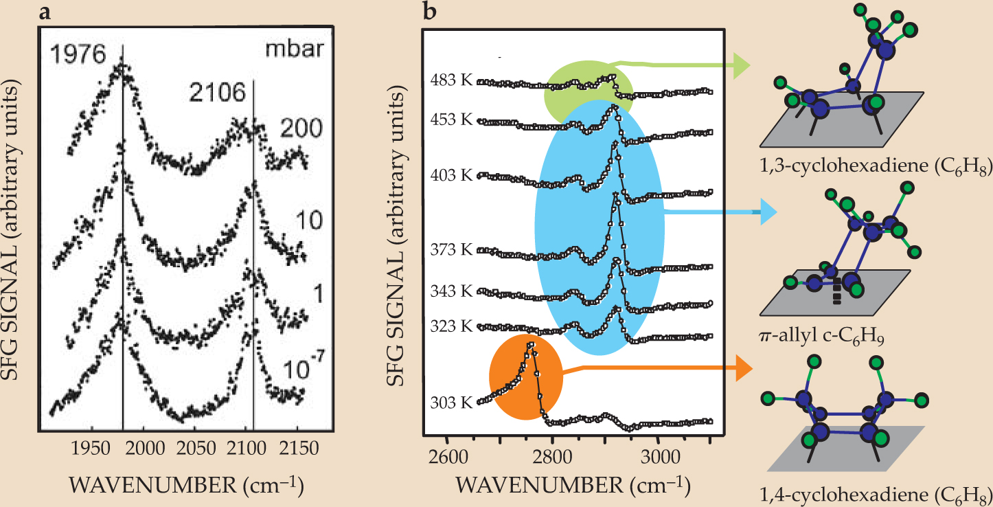 Figure 3. Sum-frequency-generation spectra (a) are virtually pressure independent. The SFG spectrum of carbon monoxide on alumina-supported palladium nanoparticles changes only modestly over 10 orders of magnitude in pressure. (b) The SFG spectrum of the platinum (111) surface during cyclohexene hydrogenation reveals three reaction intermediates: 1,3-cyclohexadiene, π-allyl c-C6H9, and 1,4-cyclohexadiene.