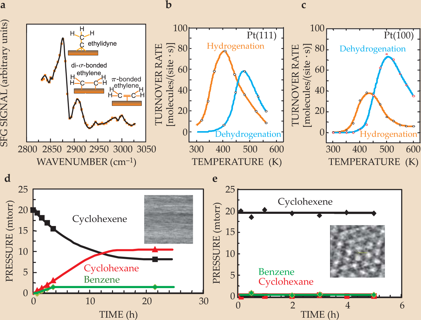 Figure 4. Hydrogenation of ethylene (C2H4) on a platinum surface. (a) Three species are detected in the sum-frequency-generation spectrum from a surface during ethylene hydrogenation. (b, c) The rates of cyclohexene hydrogenation and dehydrogenation differ between the platinum (111) and (100) surfaces. The reactions are surface-structure sensitive. (d) The progress of cyclohexene hydrogenation to cyclohexane and dehydrogenation to benzene is shown on a Pt(111) surface at 350 K. Because the adsorbed molecules are mobile on the surface, the inset scanning tunneling microscopy image shows no surface structure. (e) When carbon monoxide is added to the reaction mixture, the adsorbates lose their mobility, and the reaction does not progress.
