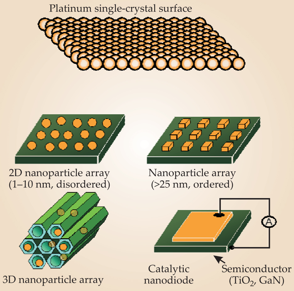 Figure 6 illustrates some of the possibilities for nanostructure catalysts. Nanoparticles are usually prepared by colloid synthesis and capped with a polymer to prevent aggregation in solution. (The polymer cap is porous and allows molecules to enter and exit to undergo catalytic reactions, although some of the metal sites can be blocked.) Two-dimensional arrays of nanoparticles affixed to a substrate can be prepared by the Langmuir–Blodgett technique,