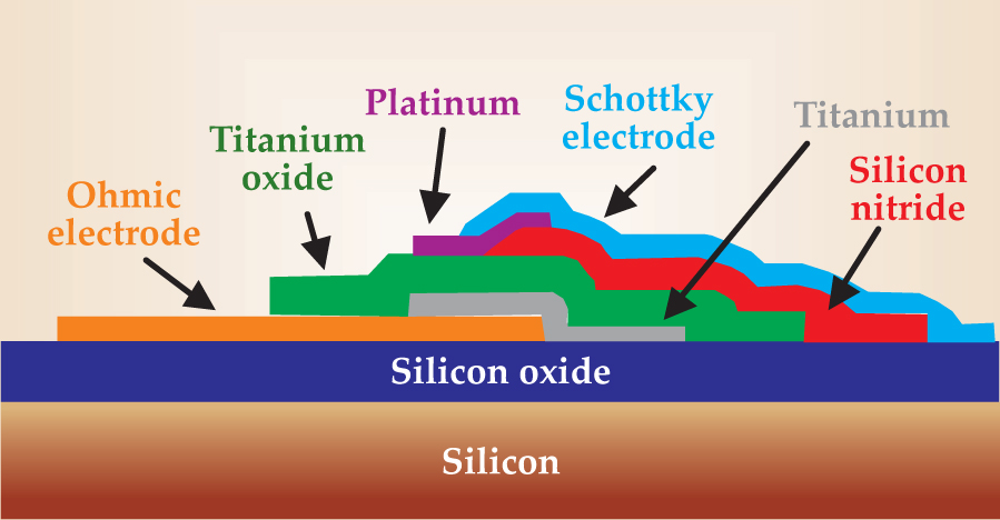 Figure 7. The catalytic nanodiode. The platinum surface catalyzes an exothermic reaction and generates hot electrons. The electrons pass into the titanium oxide layer, thermalize there, and no longer have enough energy to pass back into the Pt film. The result is a one-way chemicurrent proportional to the reaction rate.