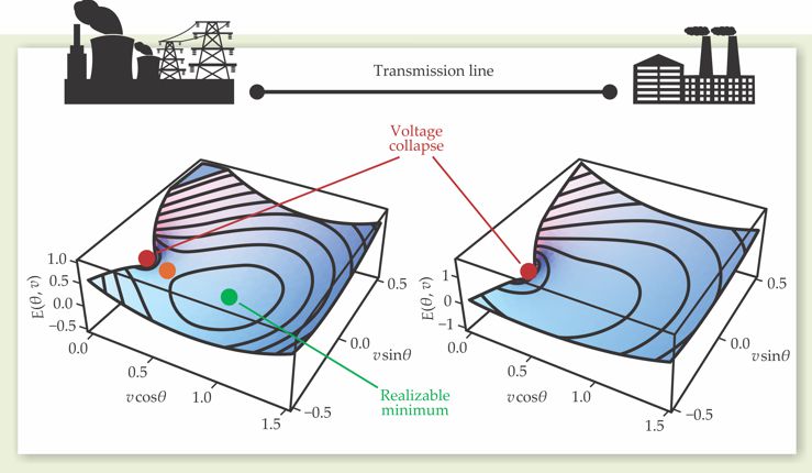 Figure 2 shows two such energy landscapes, each with a constant P and constant Q load connected to a constant-voltage node through a single inductive transmission line. In the lightly loaded case (left) there exists a local minimum energy at finite voltage, separated by a saddle point from a global minimum at which the voltage collapses to zero. If started in the finite-voltage steady state and then perturbed slightly, the system orbits around the local minimum at constant total energy. Small dissipations will return the system to that locally stable steady state, but for larger perturbations that create an energy above that of the saddle point, the system heads inexorably toward the global minimum at v = 0. The excessively low voltage generates blackouts by prompting protective equipment to disconnect parts of the grid.