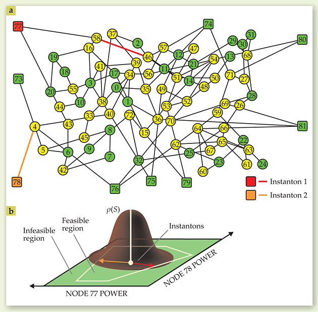 Figure 3. This transmission-grid test model (a) is composed of 81 nodes, 9 of which (squares) represent renewable-energy generators—for example, from wind and solar farms.12 Traditional generators (green circles) and loads (yellow circles) make up the rest of the network. Because renewables represent a time-intermittent source of power, probabilistic methods help gauge their influence on the grid’s stability to power fluctuations. (b) Imagine a space S (green) that represents the deviations from an expected forecast (the white dot) of the power output from two renewable-energy nodes (red and orange nodes 77 and 78). On that plane, one can estimate a probability distribution ρ(S) of possible deviations. Certain combined fluctuations in power from the two nodes can tip the network from a region where the grid can operate (the feasibility region) to one where it fails and becomes “infeasible.” The most probable instances, or points along the regions’ interface where that occurs, are known as instantons. The red and orange vectors point to two of them, and their locations in the plane indicate which lines in the network are most likely to fail.