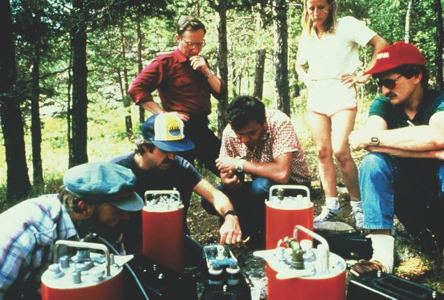 Figure 3. Monitoring a Soviet test site. A team of seismologists sponsored by the Natural Resources Defense Council, a nongovernmental American organization, setting up portable surface seismometers in July 1986 near the Soviet Semipalatinsk test site in Kazakhstan. Later, permanent seismometers were deployed in 100-m-deep boreholes. (Photo courtesy of NRDC.)