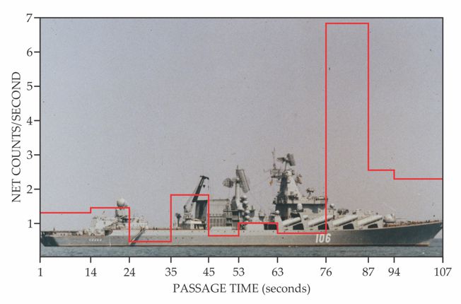 Figure 4. Soviet demonstration in July 1989 of the detection of a nuclear warhead aboard a Soviet cruiser. A neutron detector on a helicopter flying past the cruiser at a distance of 30 meters recorded plutonium-240 fission-neutron counts as a function of passage time. The large peak around 80 s on the superposed histogram of neutron counts minus background reflects the presence of a single nuclear-armed cruise missile in the front row of launchers. That peak represents a signal eight standard deviations above background.11