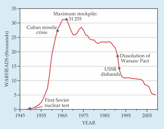 Figure 5 shows the rapid rise of the US nuclear weapons stockpile in the 1960s and its precipitous fall in the early 1990s.