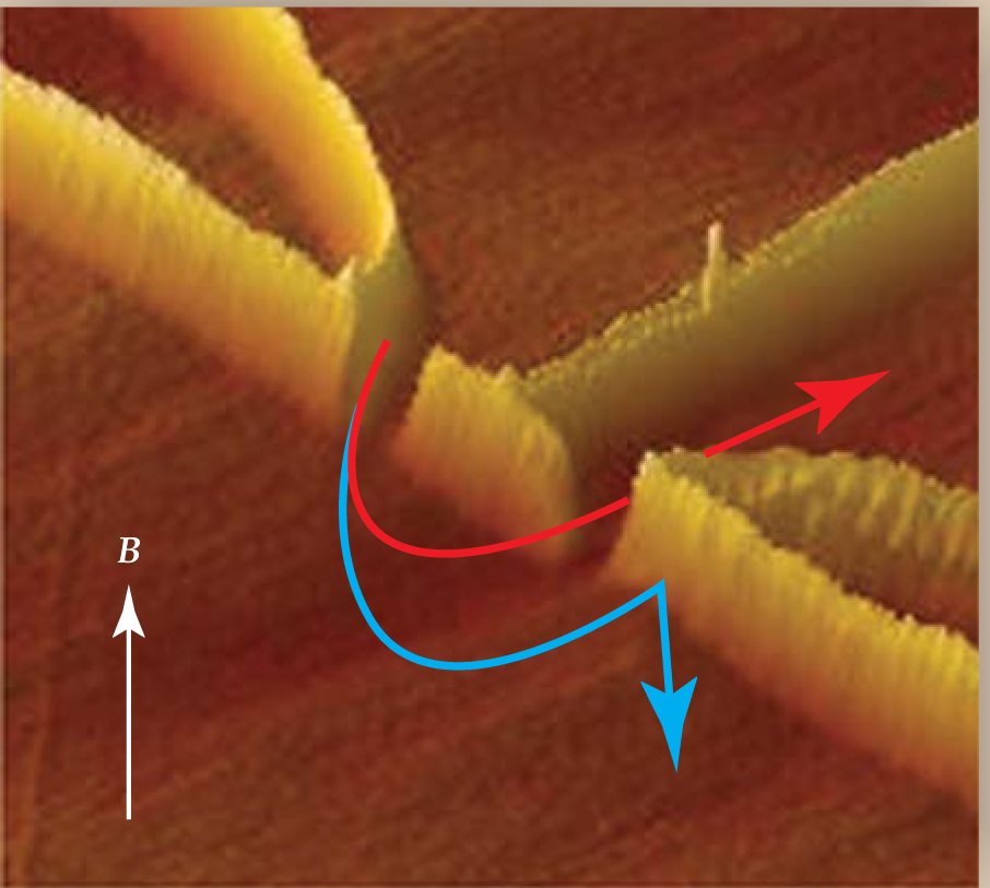 Figure 2. An atomic force micrograph of a device used to separate electrons according to their spin, a feature that could be used in next-generation spintronics. Two point contacts act as a monochromatic source of ballistic holes; with a narrow detector in a magnetic focusing geometry, they act as a tunable spin filter. The red and blue lines show the different pathways that spin-up and spin-down electrons follow. The magnetic field B is perpendicular to the surface, and the lithographic separation between point contacts is roughly 1 µm.