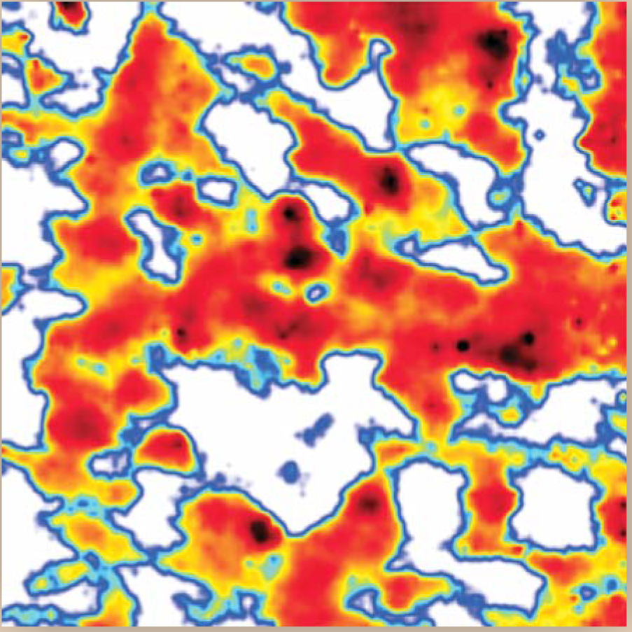 Figure 4. Scanning tunneling microscope data for a high-temperature superconductor, showing large local variations of the energy gap, the energy required to remove or add an electron. The area shown is 30 nm square, and the color scale varies from a gap of zero (white) to approximately 100 meV (black). Remarkably, the image was taken at 120 K, well above the 93 K superconducting transition temperature of the sample. Clearly, some sort of gap persists above the transition. Imaging local functionality, as demonstrated here, is a crucial route to understanding emergent properties.