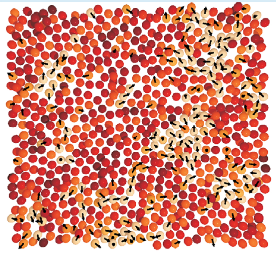 In simulations, the displacements of individual grains were found to be anticorrelated on average, and a subsequent theoretical model of grains near jamming corroborated the observation. 8 Analogous analyses in molecular and colloidal glasses revealed similar phenomena. 9 , 10 The experimental illustration in figure 2 shows dynamical heterogeneities in a 2.5-µm-thick slice through a 3D colloidal sample. Cooperative rearrangements between large groups of particles are clearly visible. As the glass transition is approached, the cluster of less mobile particles grows larger and rearrangements become much less frequent.