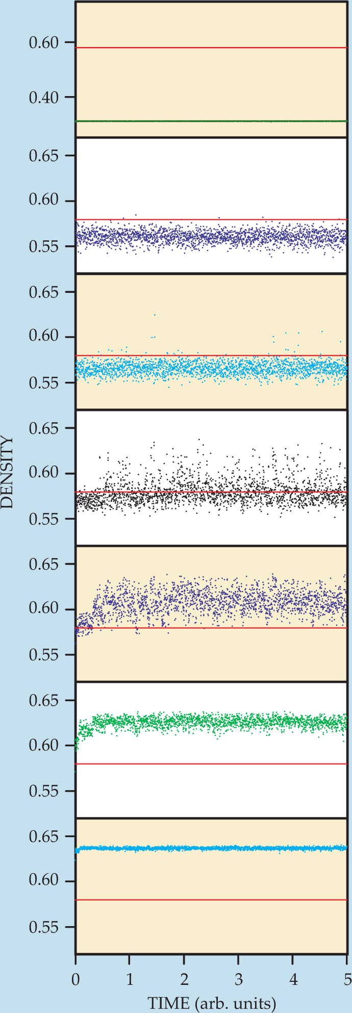 Figure 3. The densities of successive layers in a vibrating box of 1300 simulated grains as a function of time. The top panel represents the density of the uppermost layer and descending panels represent densities of progressively deeper layers; the red line, pegged at 0.58 in each panel, represents the packing density of grains laid sequentially. The densities of layers at the top, where particles are most free and mobile, experience few fluctuations about a consistently low density; those nearest the bottom, where particles are most likely to be jammed or slow moving, also experience few fluctuations, but around a consistently high density. The greatest density fluctuations occur in the middle of the box, where the widest range of particle environments are found—some particles are loosely packed, others jammed together.