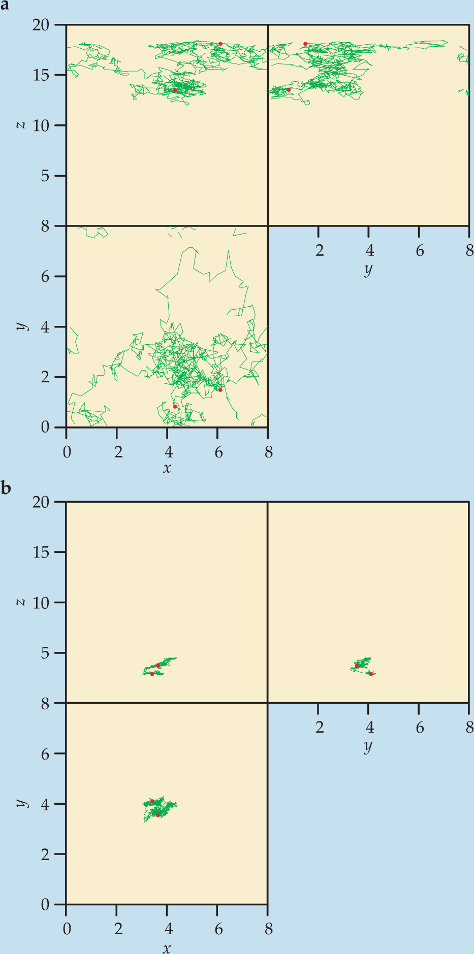 Figure 4. Simulation results for the trajectories of a single grain (green), initially located in the middle of a vibrating box of 1300 grains. The trajectories are projected onto the xy, yz, and xz planes, with start points and end-points in red. (a) When the particle explores the near-surface region, its movement is fluidlike and relatively unimpeded. (b) When it travels through lower regions, it becomes localized, constrained by its neighbors. The spatial units are arbitrary, but on the order of the grain size.