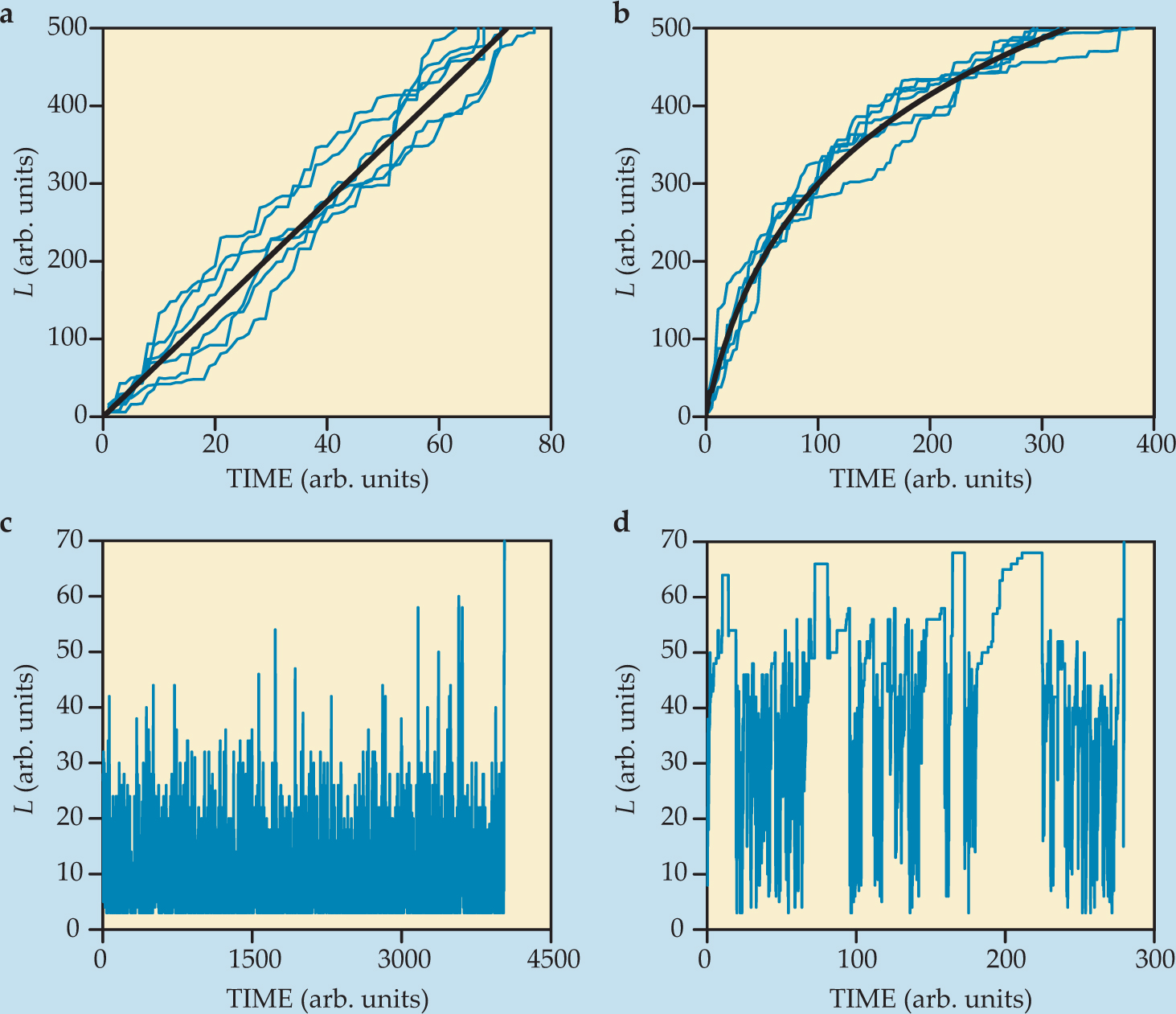 Figure 5. Zero-temperature dynamics. Lightly tapping a system can guide particles into their ground-state, ordered configuration. In these numerical plots, which illustrate the four dynamical phases of a granular column, L is the length of an ordered layer as a function of time. (a) The “ballistic” phase denotes the dynamics of particles near the top of the column. Nearly free, these particles become ordered linearly in time. (b) The “logarithmic” phase denotes the depth-dependent slowing of the dynamics in time; each track here and in the ballistic case represents a separate simulation of the system’s evolution, with the bold line a best-fit average. (c) The “activated” phase, here represented by a single track, emerges from rapid density fluctuations experienced by middle-layer grains and reveals the seemingly random variation in ordered lengths as a function of time. (d) The “glassy” phase denotes dynamics in which particles are frequently jammed and immobile. The system remains unaltered for large periods of time separated by sudden fluctuations in the length of the ordered state. At the end of the trajectory, it jams into one of two intrinsic states.