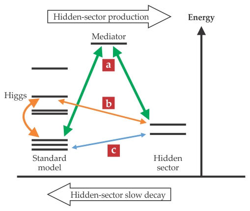 Figure 1. Portals to hidden sectors. The diagram represents the energies of possible hidden-sector states in relation to those of the standard model. Colored arrows indicate possible transitions between states. At the Large Hadron Collider, hidden-sector states can be created by means of the production and decay of heavy mediators (a), exotic decays of the Higgs boson (b), or small direct couplings (c). Once produced, the states decay through the same portals. Hidden-sector states have long lifetimes because the direct couplings are small or because energy must be borrowed, courtesy of the Heisenberg uncertainty principle, to excite the intermediate mediator or Higgs boson.