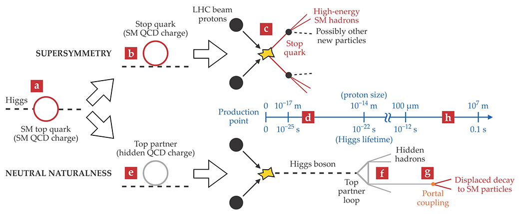 Figure 2. Supersymmetry versus neutral naturalness. The hierarchy problem in the standard model (SM) arises because quantum processes make large contributions to the Higgs boson mass and there is no natural mechanism for their cancellation. The most important contributions come from top-quark loops (a), intermittent quantum mechanical fluctuations of the Higgs boson into top and antitop pairs. In supersymmetry, the top loop is canceled by a loop of top partners called stops (b), which have a mass comparable to that of the top quark. The stops have the same quantum chromodynamics (QCD) charge as the top quarks—that is, they experience the strong interaction just as the tops do. As a result, they should be copiously produced (c) in proton–proton collisions at the Large Hadron Collider (LHC). Stops typically decay into sprays of highly energetic SM particles and possibly new invisible particles within a very short amount of time (d). Neutral naturalness solves the hierarchy problem with top partners that don’t have a QCD charge—that is, they don’t participate in the SM strong interaction.3 Under a discrete symmetry, the top quark is reflected by a top partner charged in a hidden QCD (e). Because of the absence of SM QCD couplings, those top partners are not produced in large numbers. However, due to its coupling to the top partners, the Higgs boson acquires a new decay mode that yields hidden QCD hadrons (f). Eventually those hidden hadrons can decay back to SM particles (g). The decay products are well displaced in space and time (h) from the original proton–proton interaction point.