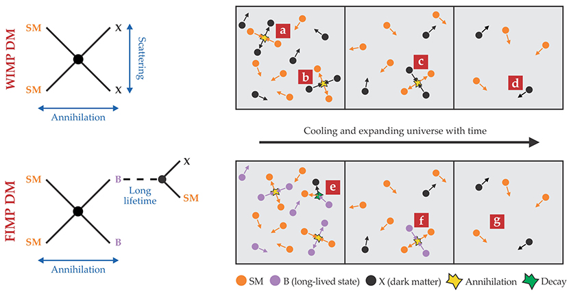 Figure 3. Dark-matter freeze-out versus dark-matter freeze-in. Early in the history of the universe, the thermal energy is much greater than the rest energy of a dark-matter (DM) particle. In that epoch, standard-model matter (SM) is in thermal equilibrium with dark matter (X); the process SM + SM → X + X (a) and the reverse process (b) occur at equal rates. As the universe cools, colliding standard-model particles no longer have the energy to create the heavy dark matter, but X still annihilates to SM (c), which drastically reduces the dark-matter abundance. As the universe cools and expands even more, dark matter becomes so diluted that annihilation to SM no longer takes place. The dark-matter abundance is frozen out and survives to this day (d). That relic abundance is dictated by the dark-matter coupling to the standard model, which sets both the annihilation rate in the early universe and the rate for dark matter to scatter off standard-model particles in direct detection experiments. On the other hand, the relic density of feebly interacting massive particles (FIMPs), an alternative to the popular weakly interacting massive particles (WIMPs), is set by a freeze-in mechanism, in which no FIMPs are initially present.5 A parent particle B has sizable couplings to the standard model and is in thermal equilibrium in the early universe. However, the long-lived B decays into SM and X (e). Even when the universe is much younger than the lifetime of the B, a tiny fraction of Bs still decays, so dark matter steadily accumulates. As the universe cools, the Bs annihilate almost completely away to standard-model particles (f). The frozen-in dark-matter abundance (g) survives to the present day. In this FIMP scenario, the dark-matter relic density is set directly by the lifetime of the B, which is typically in the millisecond ballpark.