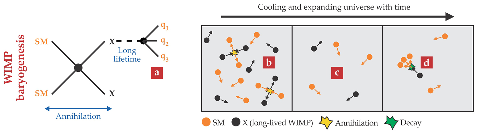 Figure 4. WIMP baryogenesis. The creation of matter over antimatter is favored by the decay (a) of a metastable weakly interacting massive particle (WIMP) X into standard-model (SM) quarks (q).6 At early times, X is in thermal equilibrium with the matter-antimatter-symmetric thermal bath (b), and as with conventional WIMPs, it eventually freezes out as the universe expands and cools (c). When the universe is about as old as the lifetime of the X, the particle decays out of equilibrium and creates the matter excess (d) that survives today.