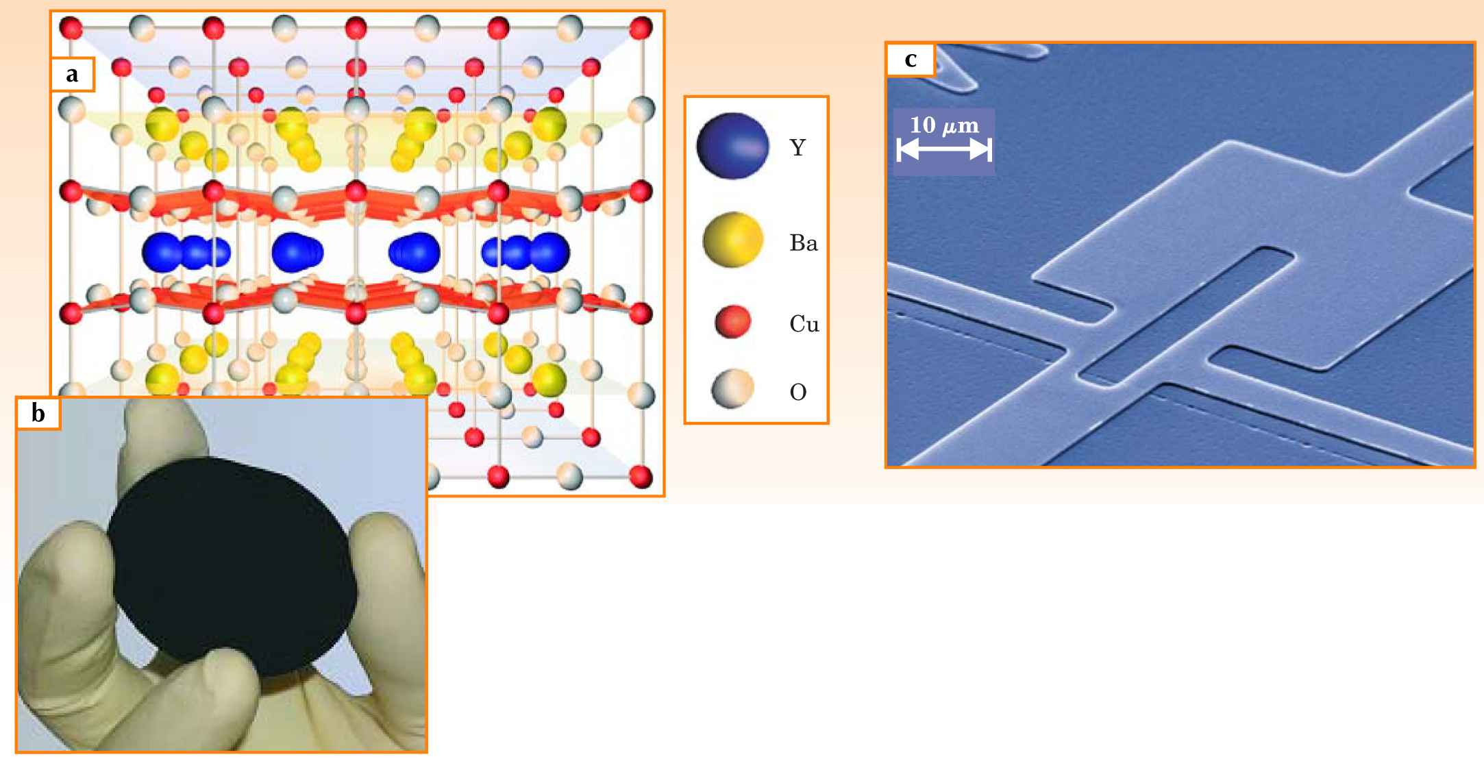 Figure 1. The cuprate superconductor YBCO (YBa2Cu3O7). (a) In the YBCO crystal structure, yttrium atoms separate two copper–oxygen (CuO2) planes, and barium atoms separate CuO2 planes from a layer of CuO chains. (b) High-quality, epitaxially grown YBCO films are a component of microwave filters. (c) A YBCO film patterned to form a superconducting quantum interference device sits atop a strontium titanate (SrTiO3) bicrystal. In the lower half of this scanning electron microscope image, one can see the 24° grain boundary generating the SQUID’s two Josephson junctions.
