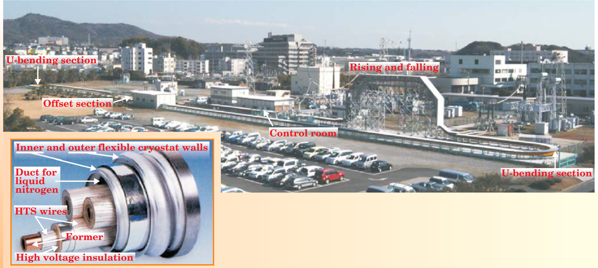 Figure 3. State-of-the-art HTS cables. A 500-m-long HTS cable developed by Furukawa Electric rises, falls, and bends at a test facility in Yokosuka, Japan. The inset shows a segment of the 100-m-long cable developed by Sumitomo Electric Industries and the Tokyo Electric Power Co, in which HTS wires wind spirally around each of three copper former cores.