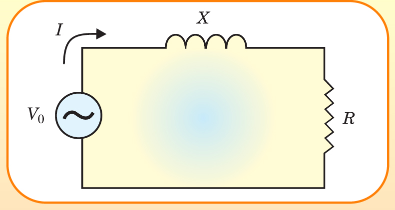 Figure 5. A model circuit. An AC voltage source V0 generating a current I through a resistance R and inductor X models important features of transmission in the electric power grid.
