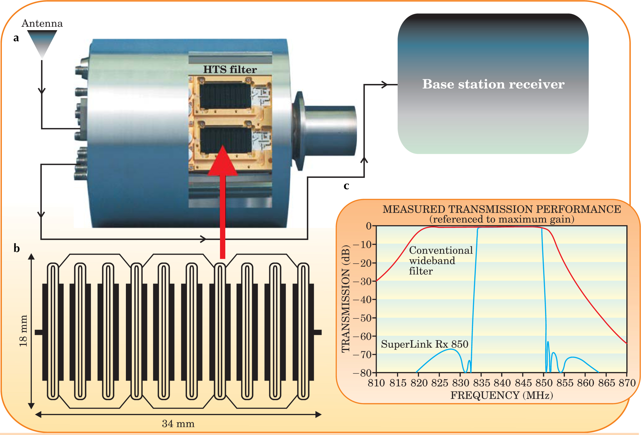 Figure 7. Improved wireless communication. Some 4000 HTS filters are currently in use at wireless base stations in the US. (a) The filters (black) sit in a cryogenic chamber between the station’s antenna and receiver. (b) The filter shown incorporates 10 folded, weakly coupled HTS strips. (c) A plot of signal transmission versus frequency demonstrates the enhanced selectivity of the HTS filter over that of a conventional normal-metal filter.