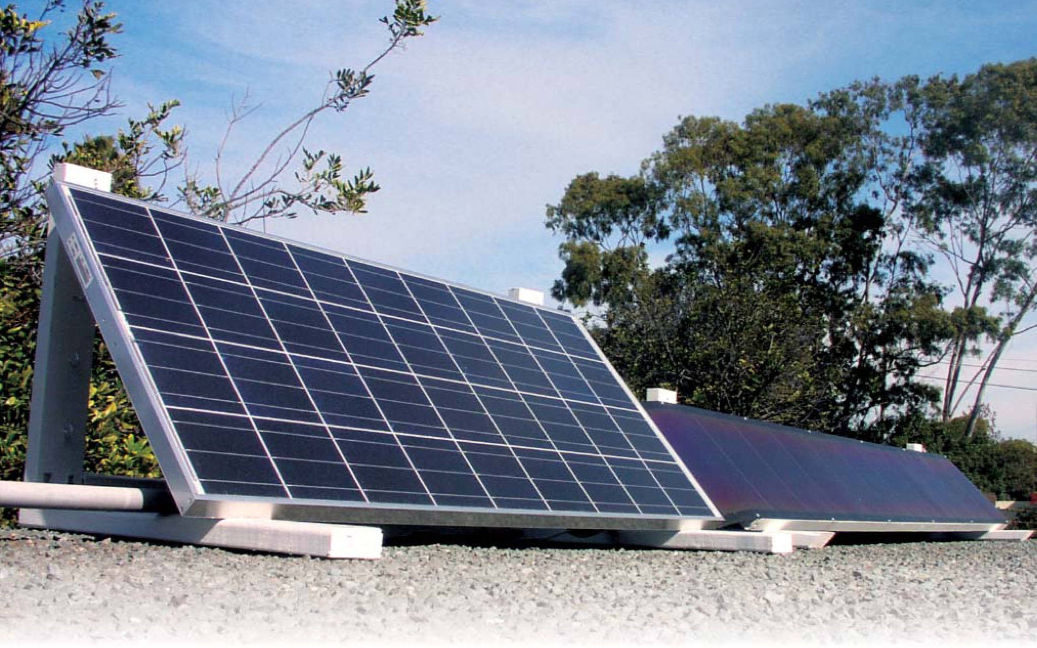 Figure 1. Photovoltaic panels for a dual system. The taller one is a 130-W polycrystalline panel that operates at 16% efficiency. It consists of 36 silicon p–n junctions, or cells, in series, each with an open-circuit (zero-current) voltage of 0.6 V. The narrower, long panel is a 64-W triple-junction amorphous arrangement of 11 cells in series; each cell operates at 1.9 V and 8% efficiency. Both panels are situated in frames that allow seasonal tilt adjustments. Here they are arranged for winter use.