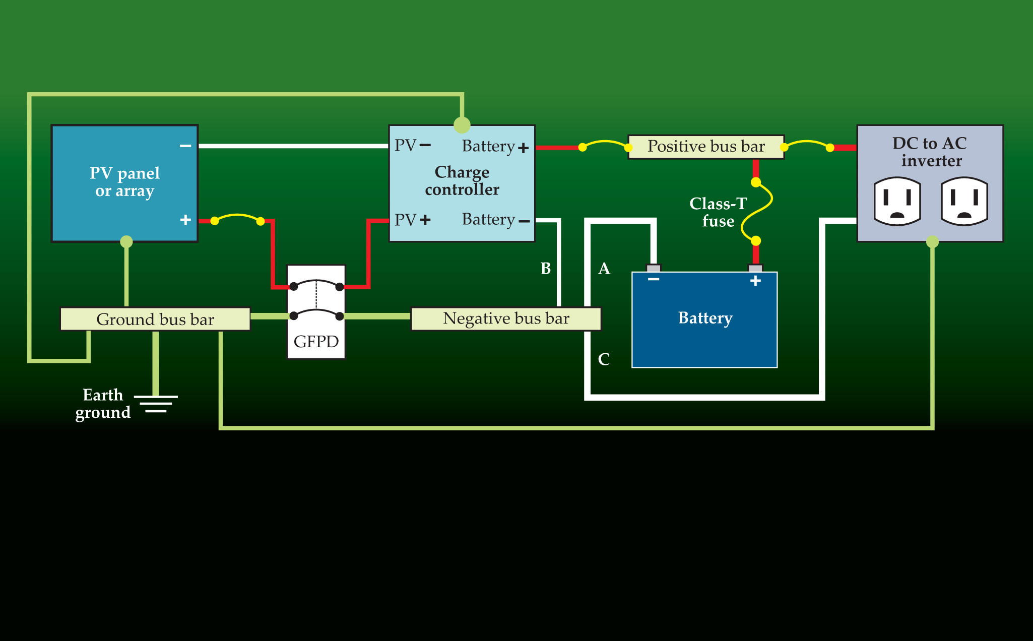 Figure 2. Circuit diagram for a standalone photovoltaic system. The breakers (yellow arcs) serve as overcurrent protection and disconnect simultaneously, but they can be implemented as fuses and disconnect switches. If the PV panels are not attached to a dwelling, the ground-fault protection device (GFPD) can be eliminated and the same bus bar, a metal strip that allows branch connections, can be used for negative and ground. All modules have grounded frames. In-line shunts can be placed at locations A, B, and C for measuring net battery current, solar input current, and load current, respectively—although, since those currents obey a sum rule, any two will suffice. Ground wires are green, negative white, and positive red.