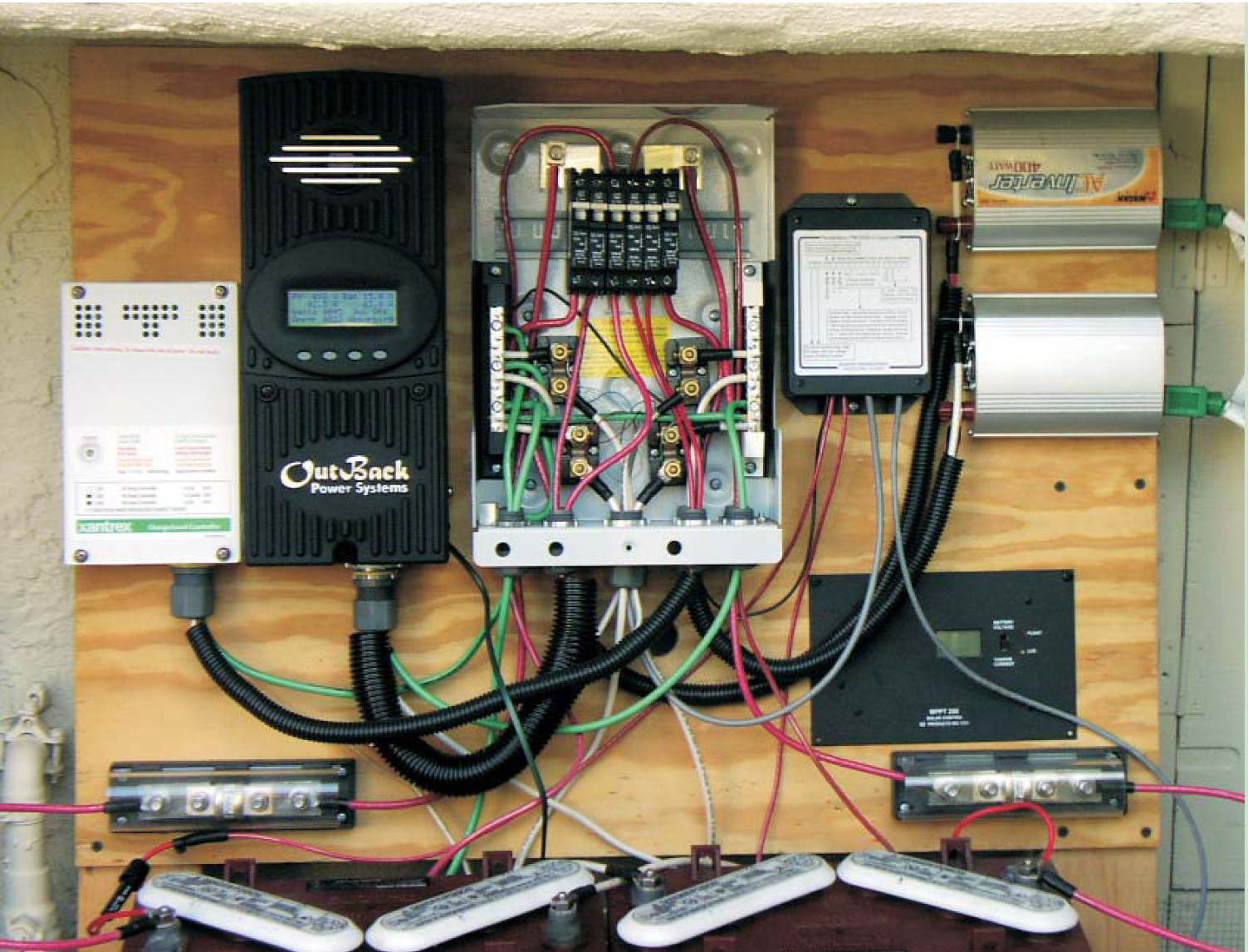 Figure 3. Power center for my dual PV system. Only half the parts are necessary for a more typical single system. Cut off at the bottom edge of the photo are two 12-V, 150-Ah batteries (one for each system), and immediately above them are 110-A class-T fuses. At left are two charge controllers. The black one is a maximum power-point tracking charge controller, as described in the text; it is certainly overkill for this small system. In the upper right are two 400-W inverters. Below them is an MPPT charge controller not currently used. To the left of the inverters is the monitoring system, capable of measuring two voltages and three currents. In the center is the exposed breaker box, showing three breakers per system, four shunts for current measurement (I use only three at a time), and for each panel, connected grounded bus bars, metal strips that allow branch connections. Ground wires are green, negative white, and positive red. The green extension cords on the right deliver AC power to appliances in the house. This particular system implementation does not require a ground-fault protection device.