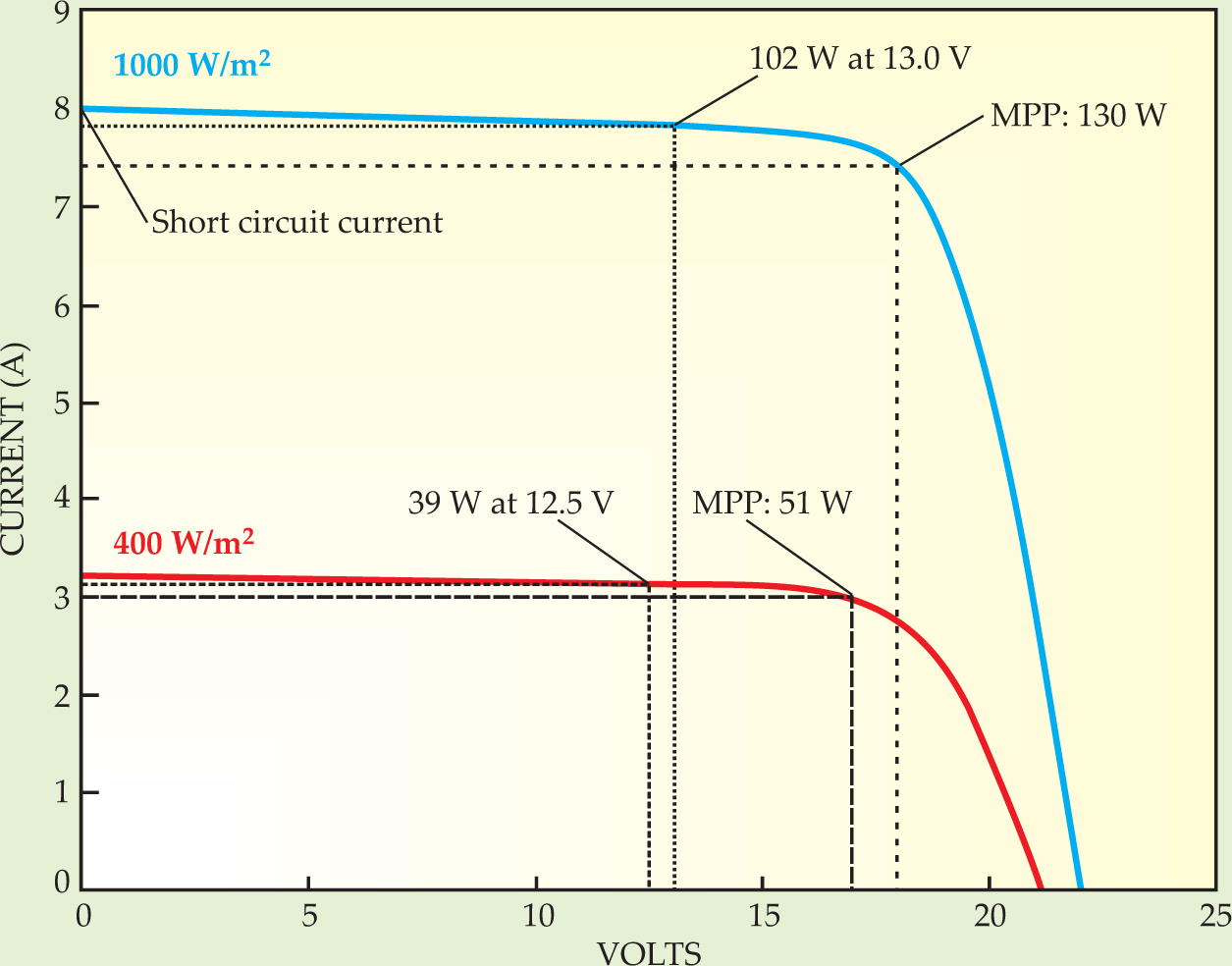 Figure 4. Current–voltage curves for a photovoltaic panel rated at 130 W at 25 °C. The blue curve shows full illumination; the red curve 40% illumination. Typical PV panels, with 36 cells in series, have an open-circuit voltage of around 22 V. Maximum power is typically delivered at around 15–18 V. At lower voltages, the PV current saturates; in full sun the saturation current is called the short-circuit current. The maximum power point (MPP) is indicated for both curves, as is the reduced power achieved by extracting current at typical battery voltages.