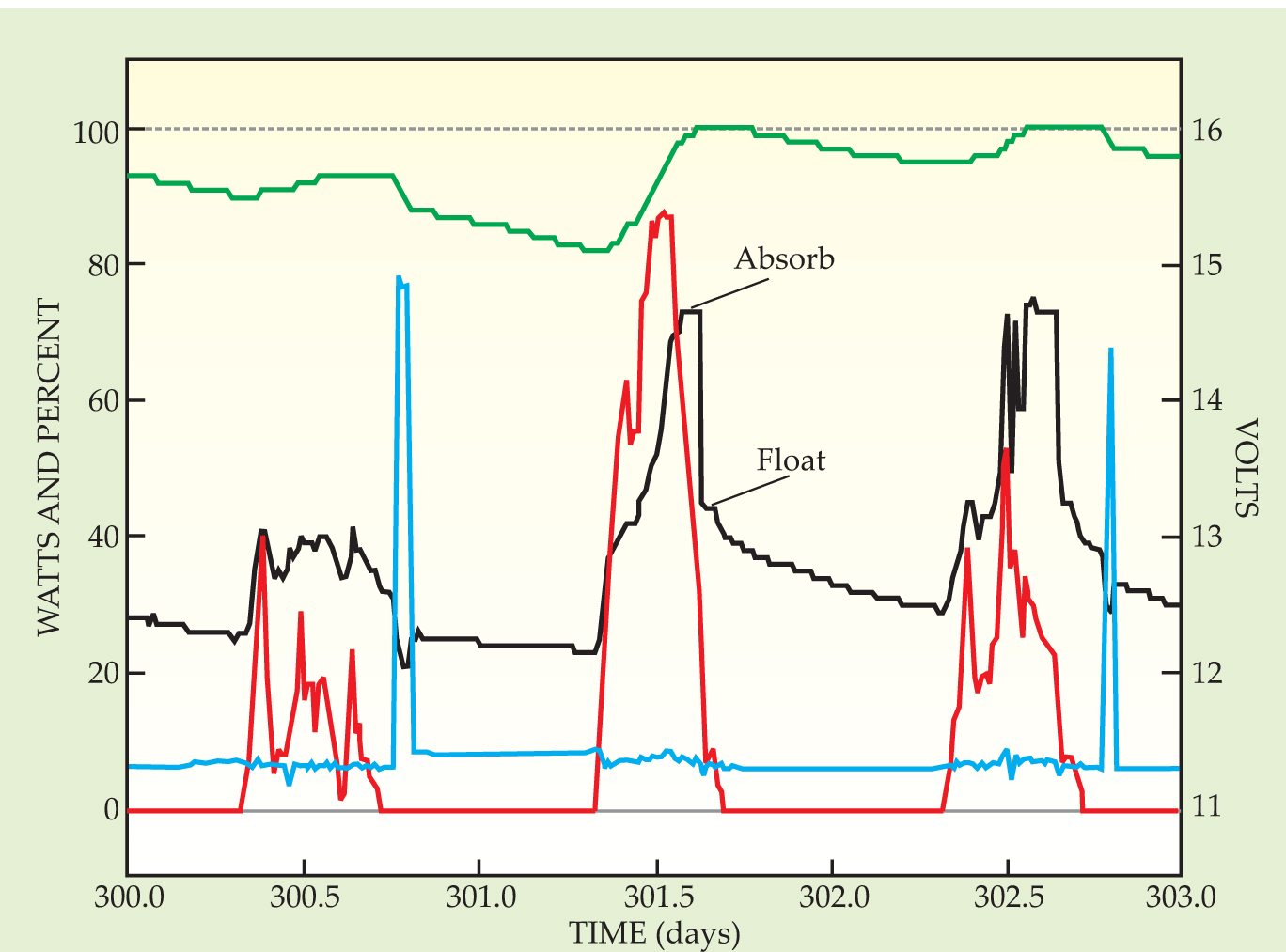 Figure 5. Sample data for a 130-W solar panel powering an entertainment system. Day 300 had a heavy but variable overcast; day 301 was mostly sunny; day 302 was cloudy. The red curve traces the solar power delivered by the panel to the charge controller, and the blue curve traces the load. Note the constant “off” load plus brief intervals of television usage. The black curve is battery voltage, as indicated on the right-hand scale. The battery reached absorption stage on days 301 and 302 and also showed intervals of float stage—indicating a fully charged battery—at the end of both days. The green curve indicates battery charge as a percent of capacity. The first day made only a small positive contribution to the battery charge, but the sunny day that followed made up for the deficit. Note that the falling edge of the solar power on the sunny day is not due to a decline in illumination, but reflects the diminishing current demand in maintaining absorption-stage voltage.