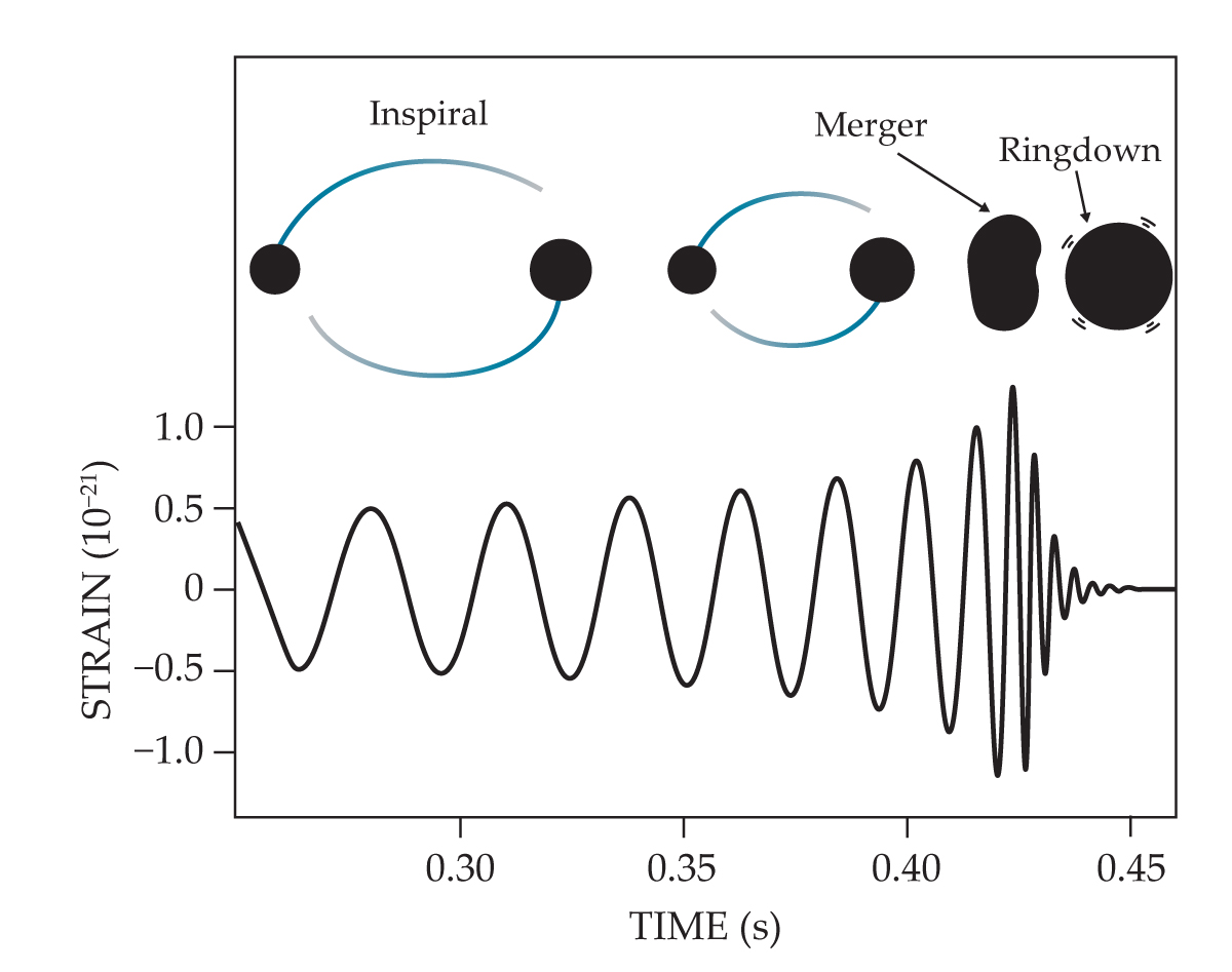 A reconstructed gravitational-wave signal (bottom) from the black hole merger detected by the Laser Interferometer Gravitational-Wave Observatory in September 2015. At top, the two black holes spiral toward each other, coalesce, and then settle into a single rotating black hole. The settling phase, known as the ringdown, is a sweet spot for analyzing nonlinear perturbations that are encoded in the signal and for testing the predictions of general relativity. (Image adapted by Freddie Pagani from ref. 1.)
