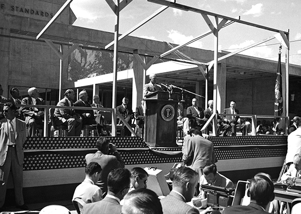 Figure 5. President Dwight Eisenhower dedicated Boulder’s new National Bureau of Standards laboratories on 14 September 1954. The labs contributed significantly to the city’s being a center of scientific activity during the International Geophysical Year, 1957–58. (Courtesy of NIST archives.)
