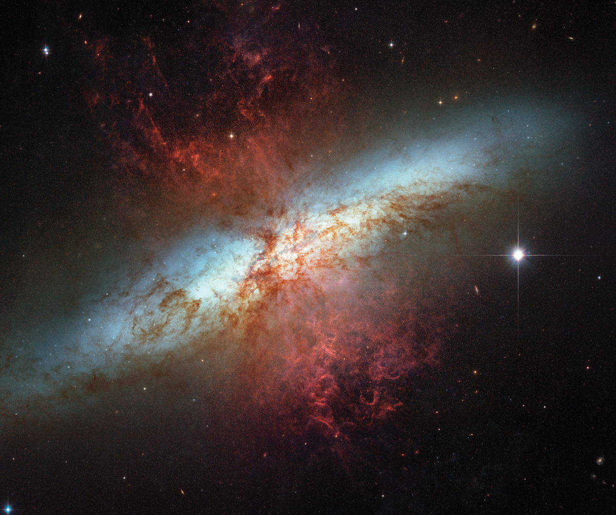 Thousands of supernovae are exploding nearly simultaneously in the nearby galaxy Messier 82. The supernovae are expelling hot hydrogen gas (red) and dust from the galaxy. Messier 82 is undergoing a massive burst of star formation in its center, causing the outflows. (Image from NASA, ESA, and the Hubble Heritage Team/STScI/AURA.)