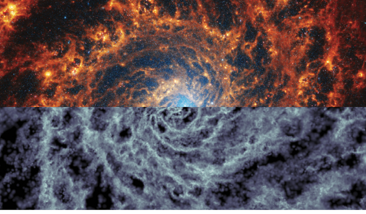 Various groups have found success with that approach. Simulations that model large volumes with comparatively coarse resolution in any individual galaxy have been able to match many of the properties of galaxy populations observed in massive surveys, such as the Sloan Digital Sky Survey. Groups whose simulations focus on individual galaxies have pushed the goalposts further: They match the observed properties and structures within galaxies. Figure 3 shows one such comparison between a nearby spiral galaxy imaged with the James Webb Space Telescope and dense gas and dust structures of a spiral galaxy from a simulation by the FIRE (Feedback in Realistic Environments) collaboration. 10 On still-smaller scales, theorists who look at patches of galaxy disks or at individual star-forming clouds have begun to advance our fundamental understanding of the interplay between star formation and stellar feedback on the scale of individual stars. The IR imaging capabilities of Webb have opened up vital comparison observations at all scales.