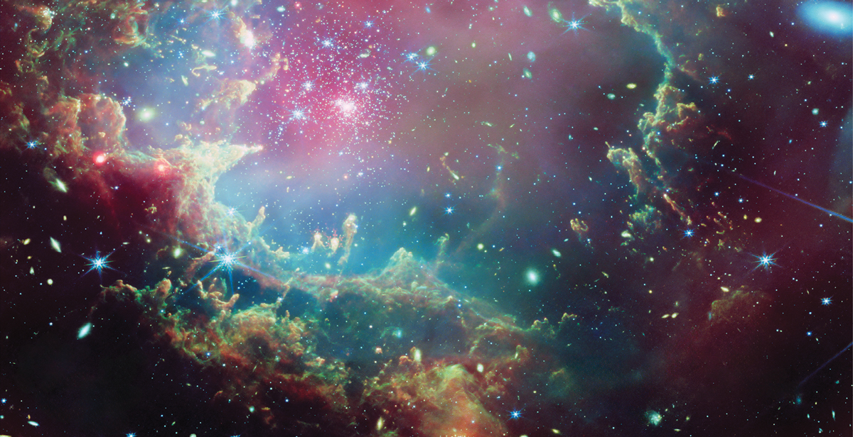 UV radiation and stellar winds from the young star cluster NGC 602 have created an expanding hole of low-density gas in the surrounding nebula. (Image composite: x-ray image from NASA/CXC; IR image from ESA/Webb, NASA and CSA, P. Zeidler, E. Sabbi, A. Nota, and M. Zamani; image processing by NASA/CXC/SAO/L. Frattare and K. Arcand.)