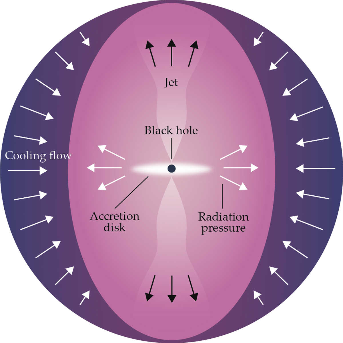 High-luminosity AGNs release most of their energy through intense radiation from the accretion disk; that radiation heats the surrounding interstellar medium (ISM) in the galaxy and circumgalactic medium (CGM) in the galaxy’s immediate vicinity. The heat prevents the CGM from cooling and collapsing into the galaxy and, subsequently, from creating star-forming regions. Additionally, the radiation can drive powerful outflows of gas and expel the gas from the galaxy altogether. Those outflows can remove large reservoirs of cold gas, effectively limiting the fuel necessary for stars to form. That quenching is responsible for transforming blue, star-forming disk galaxies into elliptical galaxies colloquially referred to as “red and dead.” Such galaxies are characterized by little to no new star formation because of the lack of cold CGM gas falling into the galactic ISM.
