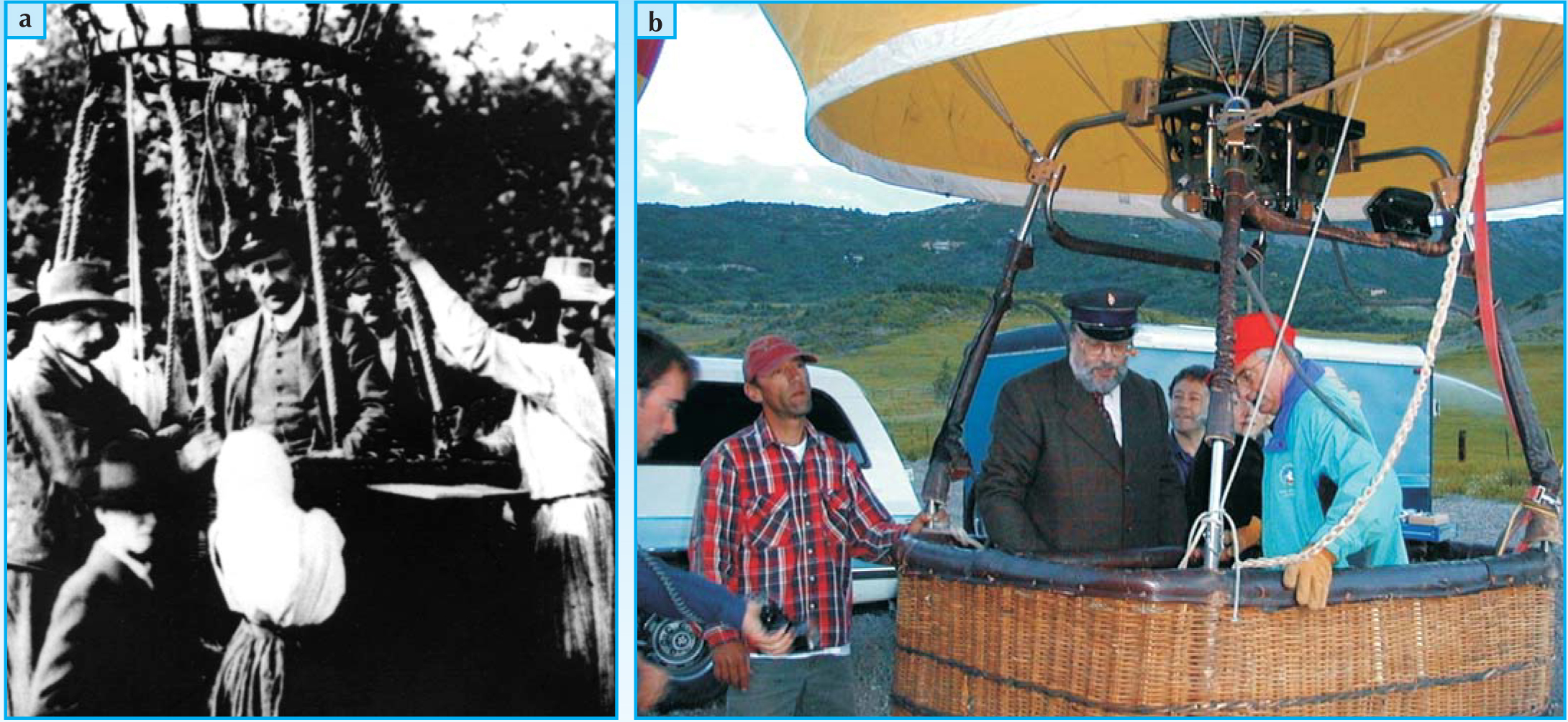 Figure 1. Science performance. (a) This photo of Victor Hess embarking on the 1912 balloon flight in which he discovered that cosmic rays originate beyond Earth’s atmosphere inspired Jeff Wilkes and Greg Snow to stage a reenactment at the 2001 outreach program at Snowmass Village, Colorado. (b) In the 2001 flight, Wilkes (with beard) took off at dawn, a cap on his head and a period detector in the gondola. Snow recorded the data and explained it to the audience.