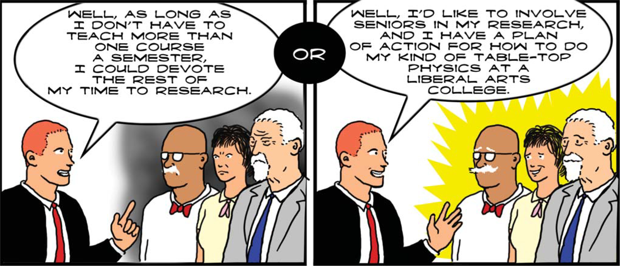 It should be a given, but don’t undermine an otherwise good interview with thoughtless remarks or behavior. When asked about research that students might do in your lab, have a carefully worked-out plan for senior projects. You should not be surprised and suggest, “Well, they can help solder circuit boards or clean glassware.” Don’t ignore researching the institution, then startle the committee with a sudden epiphany: “Wait—you have to teach your own labs without graduate teaching assistants?” We relate these remarks because, ironically, they were made by otherwise talented candidates talking to our dismayed colleagues at other institutions.