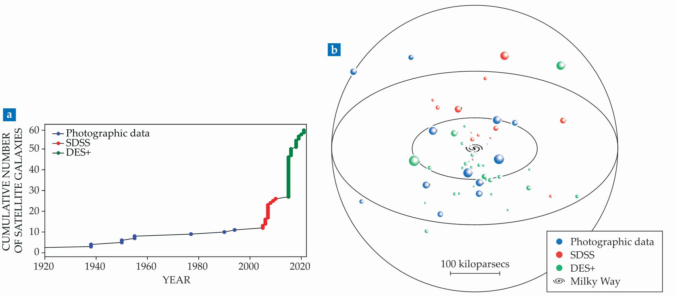 Satellite galaxies are easier to discover since the advent of digital sky surveys. (a) Before 2000, only 11 were found, largely by scouring photographic plates. The Sloan Digital Sky Survey (SDSS) and the Dark Energy Survey and others (DES+) are responsible for increasing that number to more than 60. (b) The spatial distribution of satellite galaxies around the Milky Way.