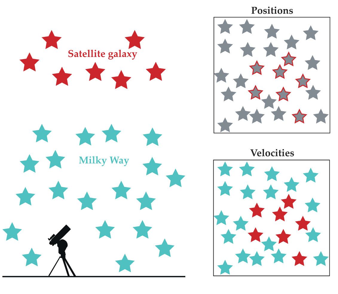 A satellite galaxy imaged by an Earth- or space-based telescope, as illustrated on the left, captures only the stars’ positions. That information (top right) is insufficient to definitively determine which stars in the field of view are part of the satellite galaxy. But the satellite is moving relative to the Milky Way, where the observer is located. When velocity data are taken into account (bottom right), the stars become distinguishable as distinct populations.