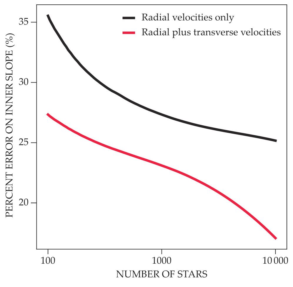 The precision to which a galaxy’s mass density profile can be determined depends on the number of observed stars. Here, the estimated error in the key property of the density profile—its inner power-law slope—is plotted as a function of the number of stars observed. The black curve assumes that only radial-velocity measurements are available for each star. The red curve assumes that both radial- and transverse-velocity measurements are available. Errors of 2 km/s are assumed on individual radial-velocity measurements, whereas 5 km/s is assumed for transverse velocities. An inner-slope measurement with a certainty of 4−5 standard deviations can only be obtained with three-dimensional velocity measurements. (Courtesy of Juan Guerra, Yale University.)