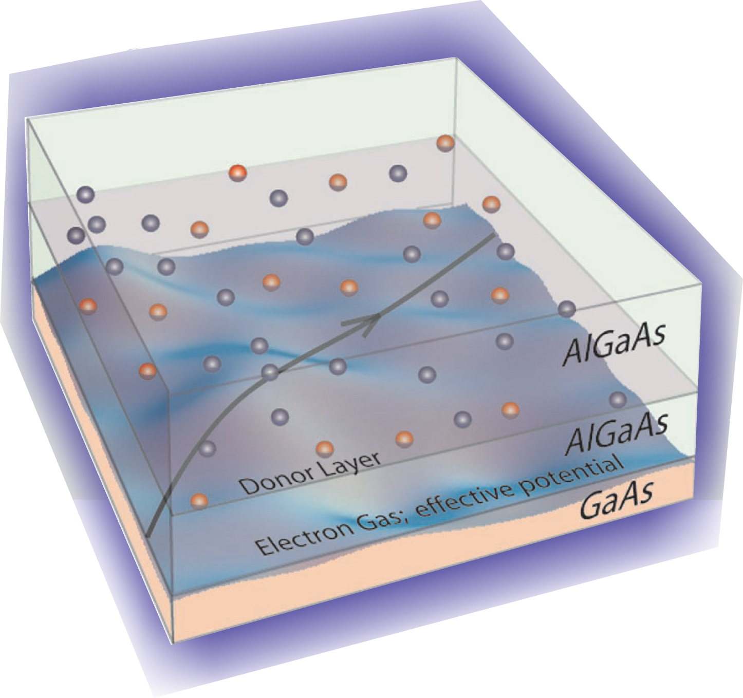 Figure 1. A two-dimensional electron gas formed at the interface between gallium arsenide and aluminum gallium arsenide in a semiconductor heterostructure. The AlGaAs layer (green) contains a layer (purple) of silicon donor atoms (dark blue). Electrons from the donor layer fall into the GaAs layer (pink) to form a 2DEG (blue) at the interface. The ionized Si donors (red) create a potential landscape for the electron gas; the resulting small-angle scattering smoothly bends electron trajectories, as shown.
